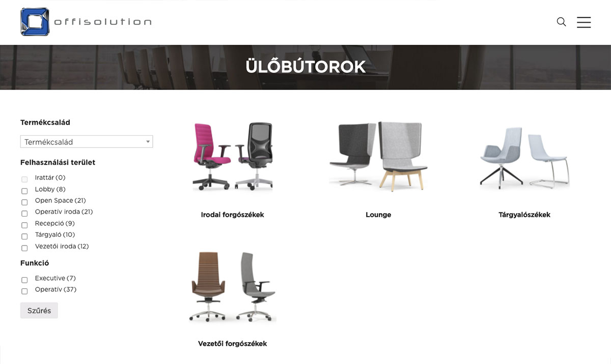 Irodabútor termékkatalógus weboldal készítés, részletes termék szűrési lehetőséggel. A weboldal Wordpress weboldal motorral működik, mely könnyen kezelhetővé teszi a folyamatosan megújuló termékek feltöltését.